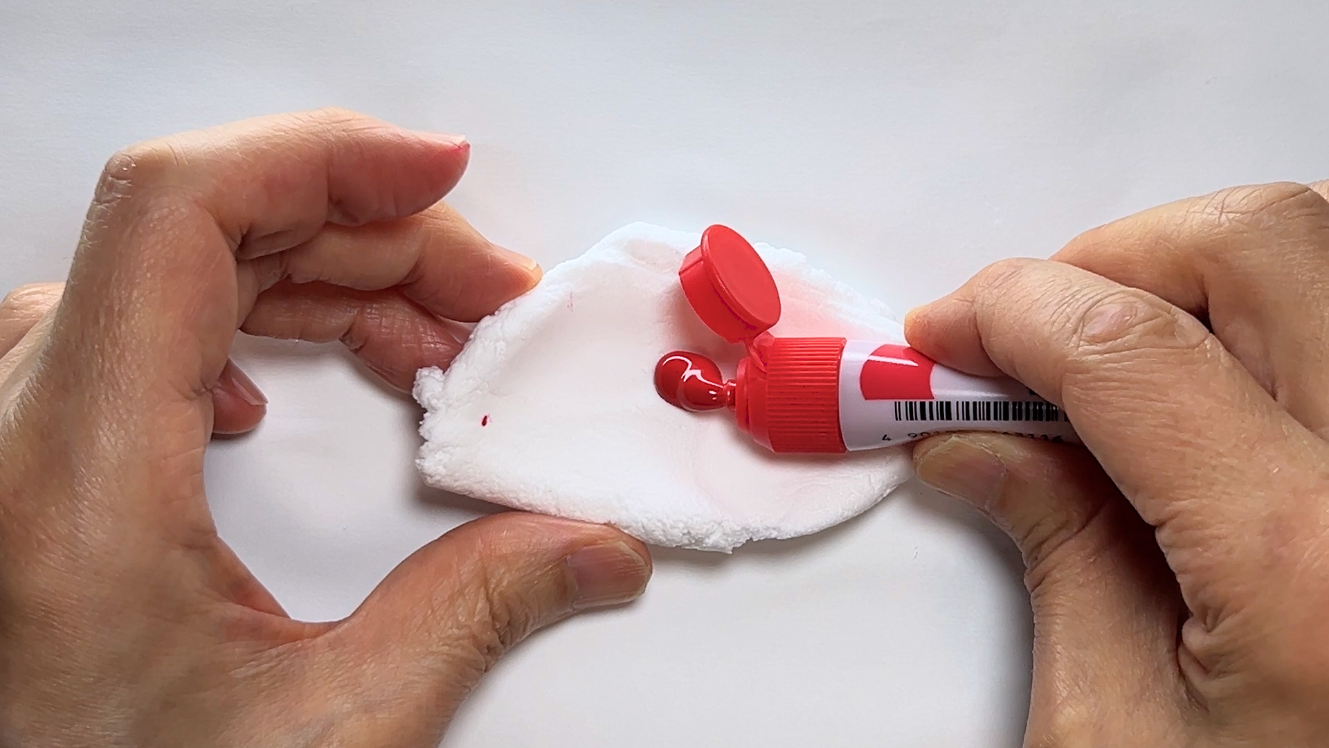 できるだえのぐにさわらないようにして混ぜていきます。混ぜ方のコツは、「伸ばしてたたむ」ことです。伸ばしてはたたみ、たたんでは伸ばすを繰り返すと、色が全体に広がって均一な色粘土になります。