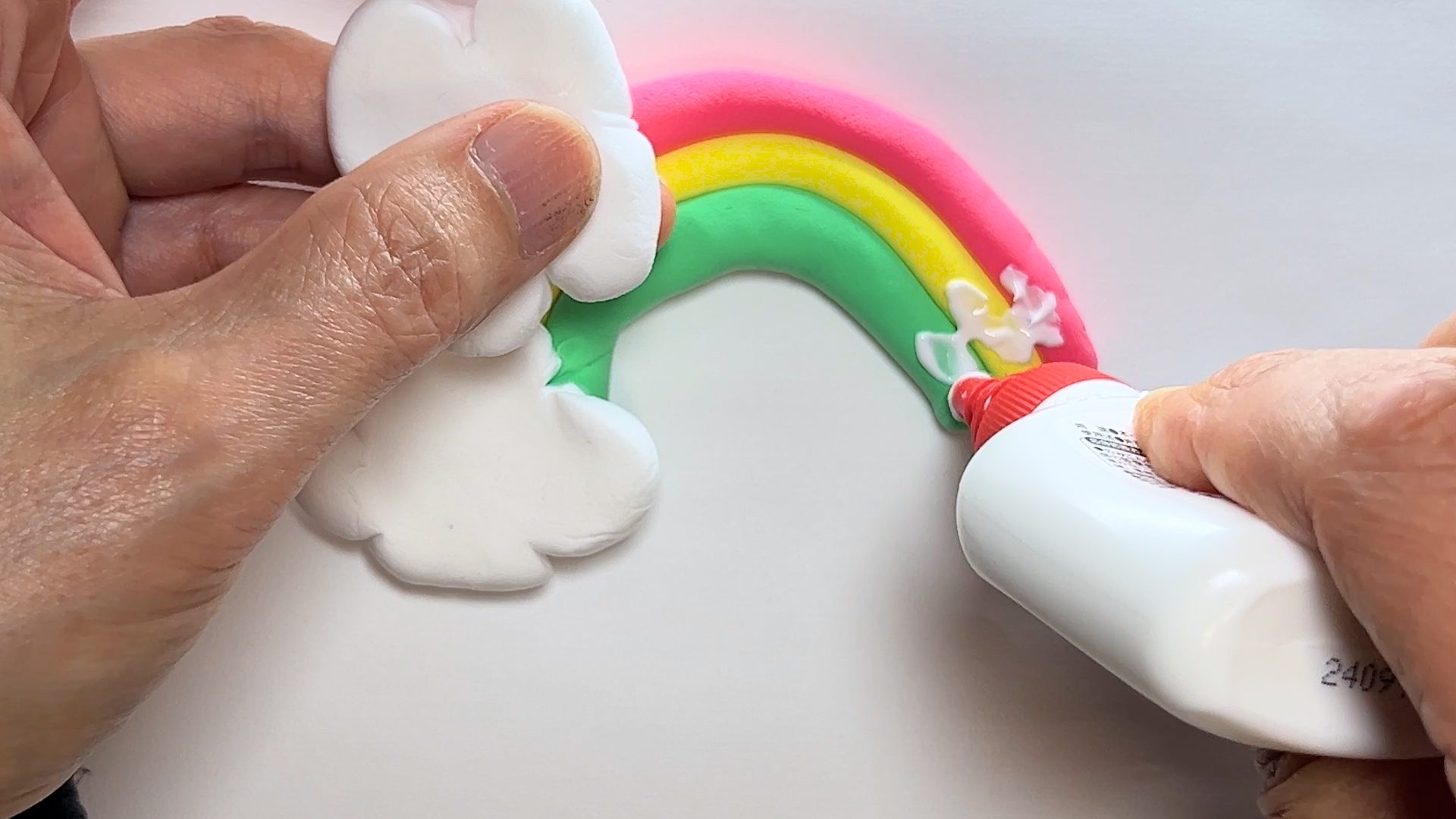 粘土どうしは押し付けるだけで付けることができますが、取れやすい形や粘土が硬くなってきた場合は接着剤を使います。色と形の組み合わせでいろいろなものができます。