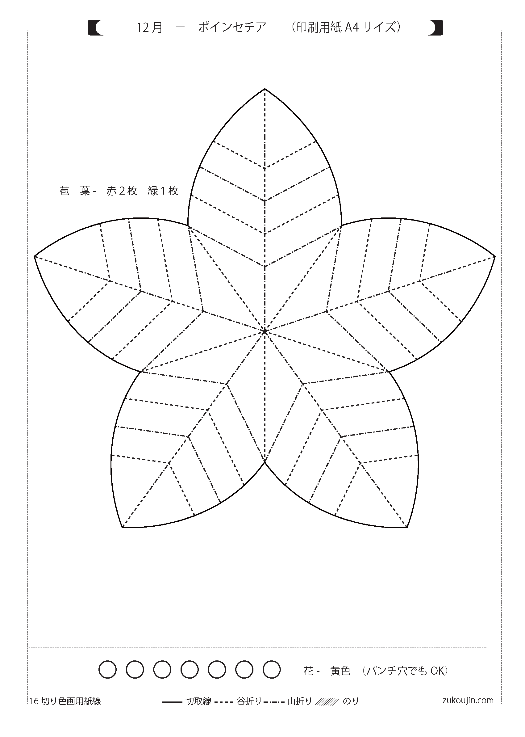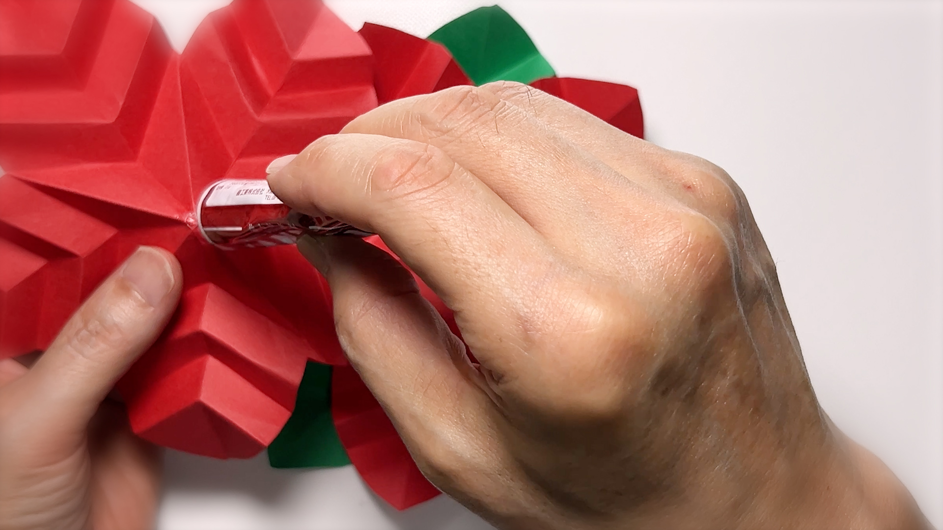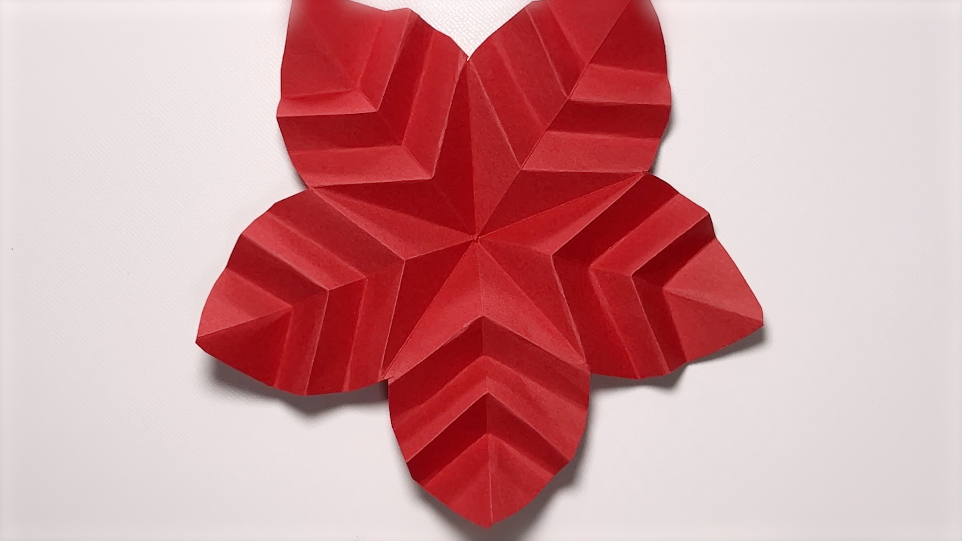 12月のクリスマスシーズンにぴったりなポインセチアの壁面飾りです。ジャバラ折りで立体的な作品になりますが、その過程でできる中央部の星形がクリスマスの雰囲気を盛り上げます。
