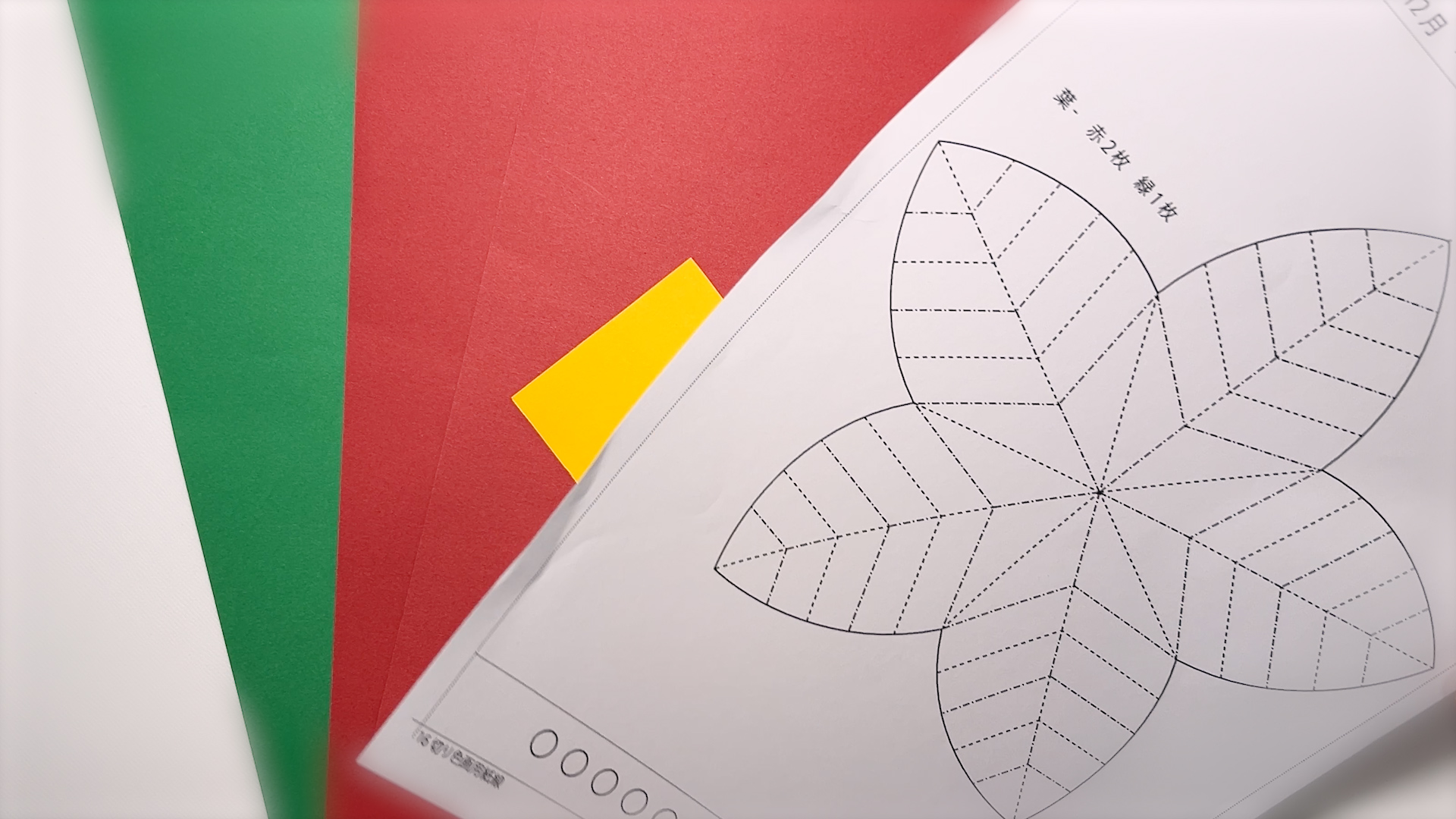 ひとつのポインセチアを作るのに赤が2枚、緑が1枚必要です。どれも同じ大きさですので、重ねて切ると手早くできます。3枚の色画用紙と型紙を重ねてホッチキスで留め、型紙に合わせて、ハサミで切ります。