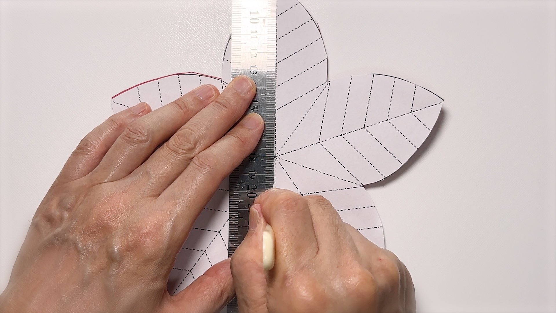 折りやすいように、ハサミの先やヘラなど、先の細いもので折り線を入れていきます。まず中心を通る5本の線を定規を当てながら入れます。次に短い折り線を入れていきます。こちらは、定規を使わない方が、やりやすいでしょう。
