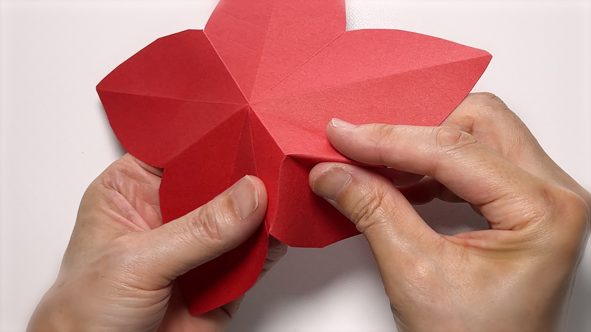 斜めの葉脈は内側から折っていくといいでしょう。山折りだった中心線を谷折りに変えながら、斜め線をつまむようにして山折りにします。