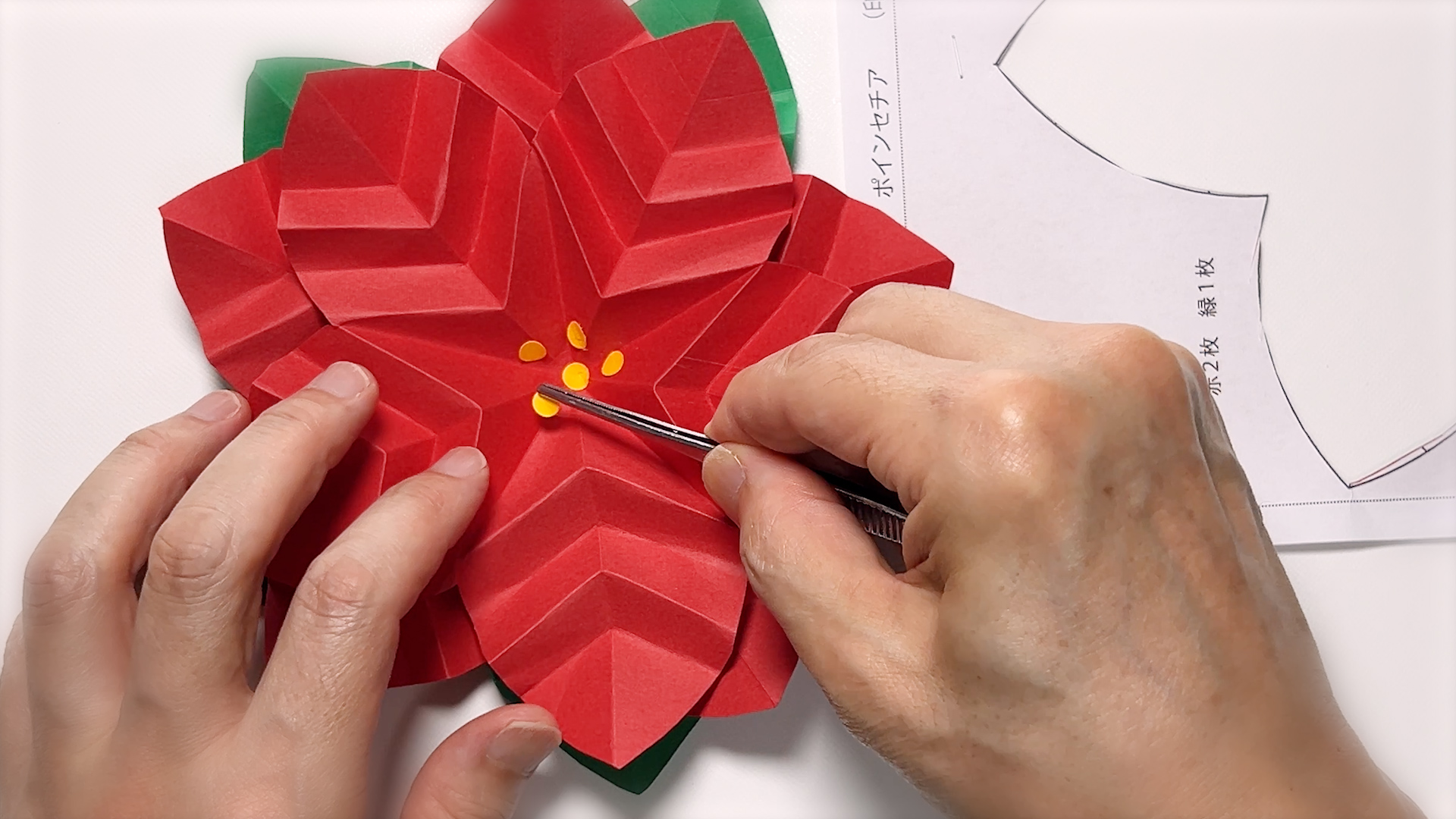 花の黄色の部分を切るにはパンチを使うと簡単です。パーツが小さいので、ピンセットを使って接着するといいでしょう。